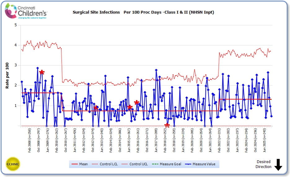 The number of surgical cases per 100 trips to the operating room (procedure days) where patient developed an infection following surgery.