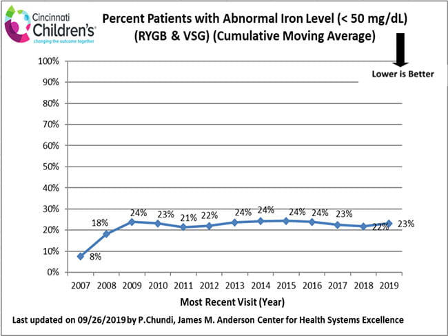 These data include all patients who have had a follow-up visit at least 18 months following weight loss surgery. We use this period so that enough time has passed following surgery to evaluate vitamin levels.